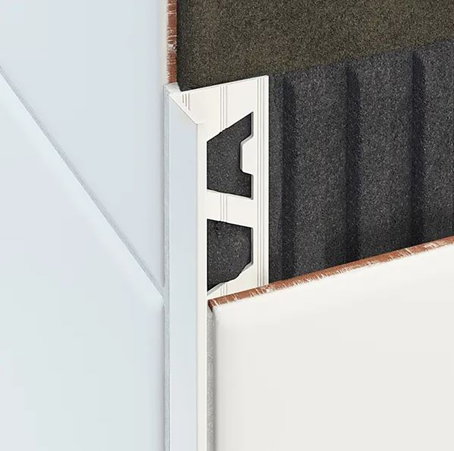 An Aluminium profile for protecting and finishing tiled corners and edges. Provides a decorative finish and protects adjacent tile edges. Features a perforated anchoring leg for securing in adhesive or mortar bond below the tiled surface. Chemically pre-treated and polyester powder coated.