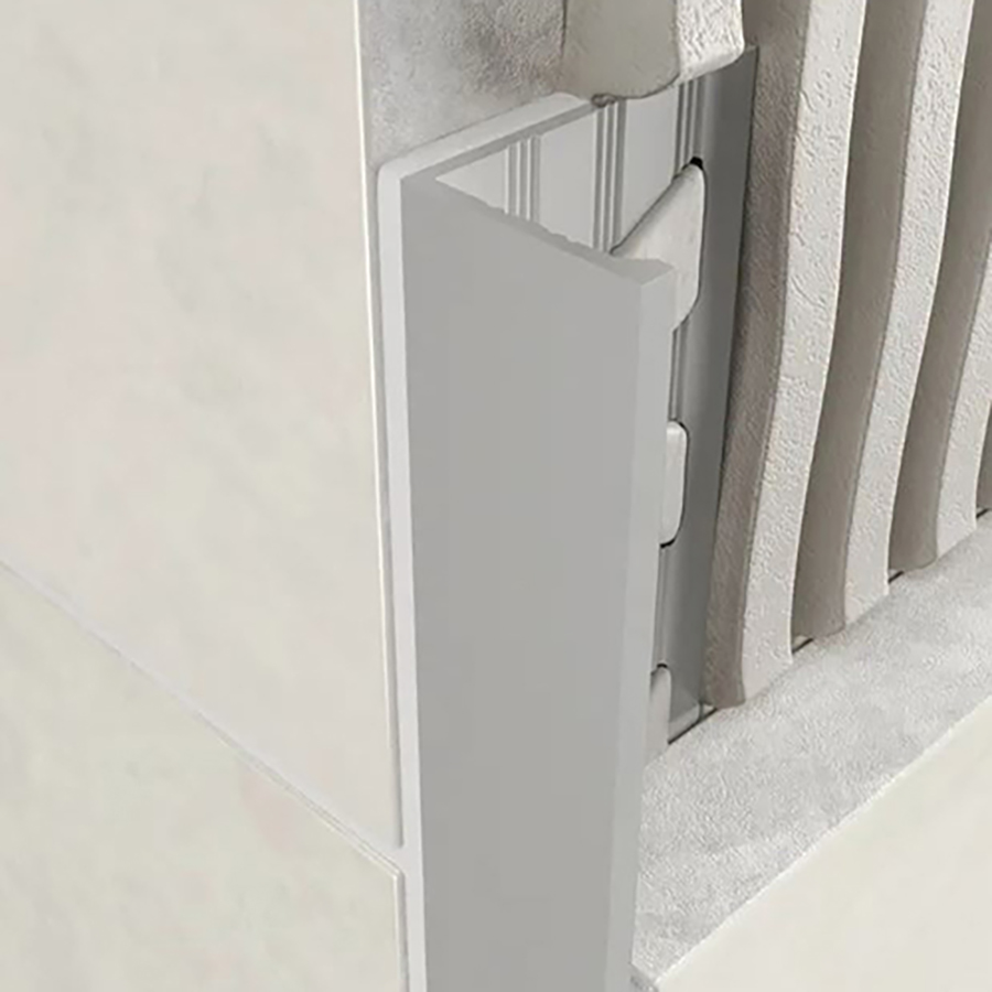 An Aluminium profile, anodised for extra protection. Used for finishing tiled corners and edges. Provides a decorative finish and protects adjacent tile edges. Features a perforated anchoring leg for securing in adhesive or mortar bond below the tiled surface.