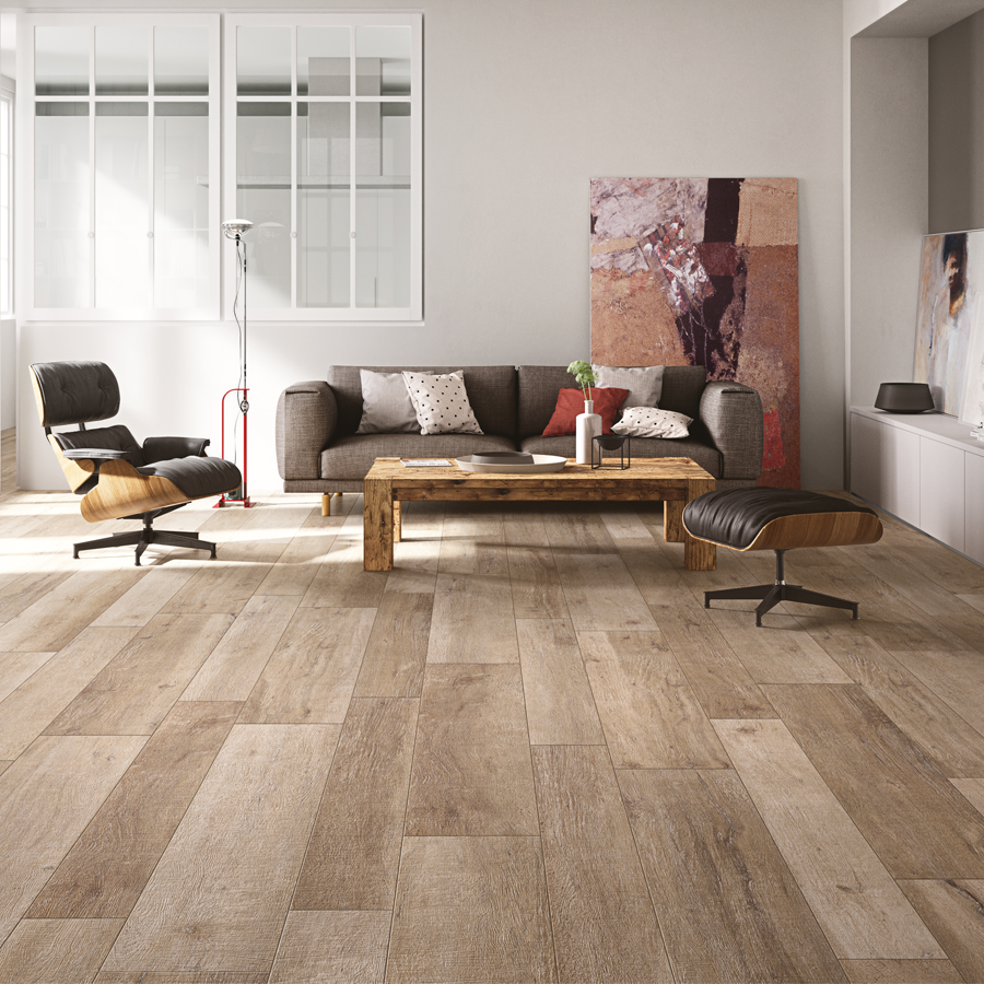 A high-end timber look floor tile suitable for all indoor use, al fresco and covered patio areas. This 14mm thick, rectified matte finish tile is inspired by the wood planks of the Dolomites.  Made in Italy.