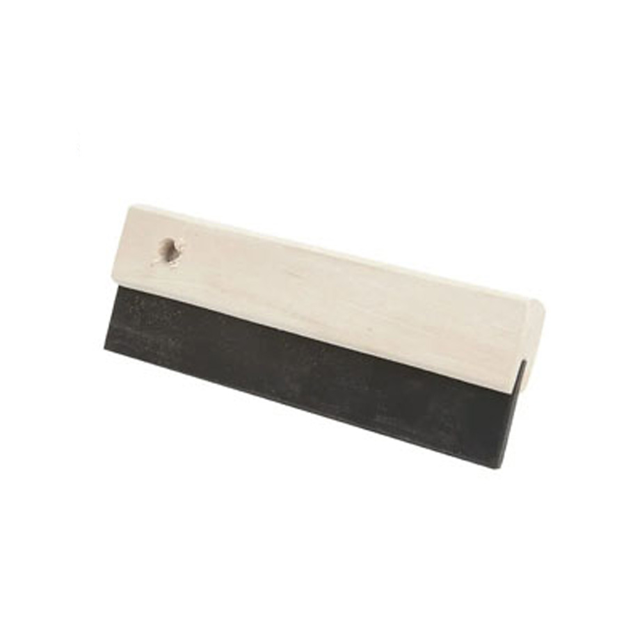 An ergonomically designed handyman grouter with a wooden handle grip and flexible rubber blade.